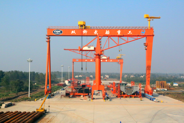 室外船臺共2座,尺寸為710mX100m,可同時容納8艘海洋工程特種船進行船臺總裝,擁有300T門式起重機2臺,40T六座式起重機2臺。