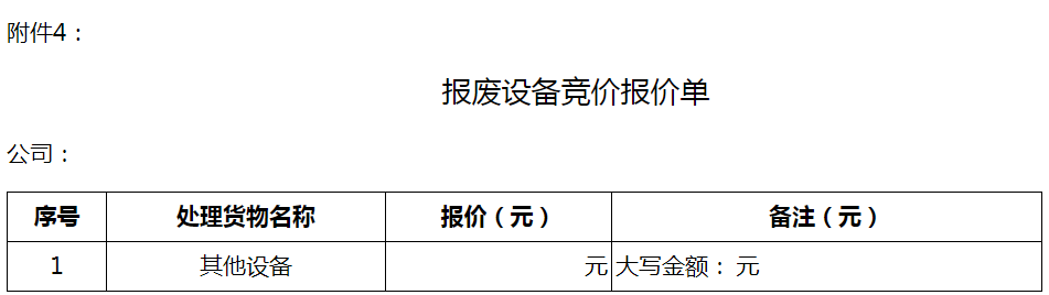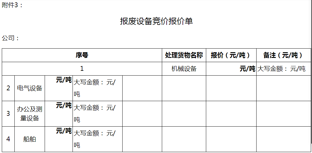 (2)報價要求:按附件3“報廢設備競價報價單”的機械設備、電氣設備、船舶、辦公及測量設備等四項內容,以及附件4“報廢設備競價報價單”的其他設備分別填寫第一次報價,原則上單項最高報價中標;若兩個及以上投標商在同一競價項目的價格相同且為本次競價的最高報價,則對該項目重新進行現場報價;若投標商愿意以更高價格收購,可進行多次現場競價,最終確定最高中標價格和中標方。